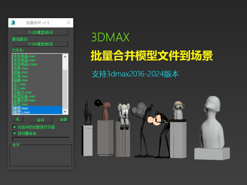 能快速合并多个3d模型文件到场景。浏览指定本地电脑3dmax模型文件夹,在插件显示的文件列表中,可多个选择文件执行一次性快速合并到3dmax场景中。加快3dmax工作效率。支持3dmax2016-2024版本,拖拽插件至3dmax界面即可使用。
