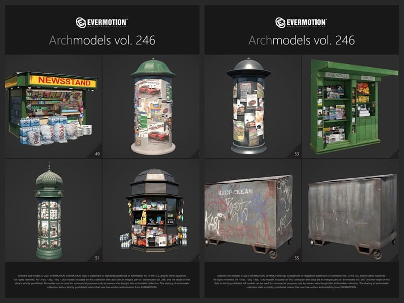商店广告牌报亭垃圾箱栏杆公共设施3D模型 Evermotion – Archmodels Vol.246 (3DS MAX格式)