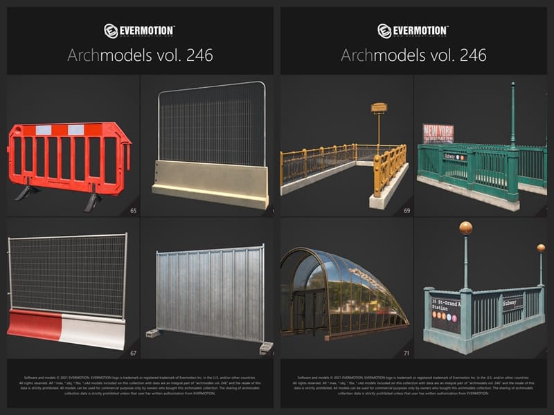 Archmodels vol. 246包含96个街道室外商店招牌公共设施等3D模型,比如商店广告牌、垃圾箱、报亭、广告柱、栏杆和建筑元素、公共交通站等,3DS MAX格式,Vray和Corona渲染器,包含贴图材质